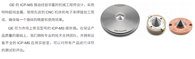 GE 的 ICP-MS 锥由经验丰富的机械工程师设计,采用特种超纯金属,使用先进的 CNC 机床和电子束焊接加工而成,确保每一个锥体的精度和使用效果。