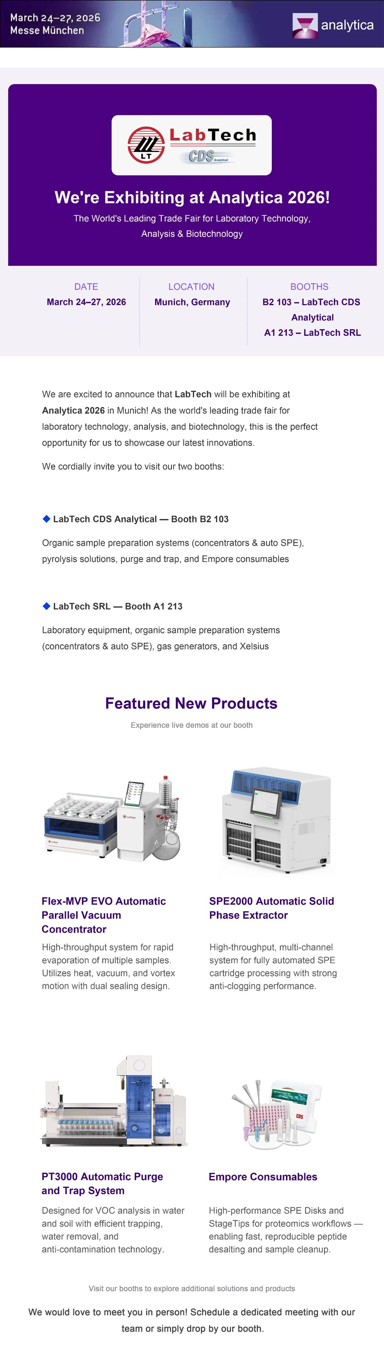在这个万物复苏的春天,莱伯泰科将再次跨越重洋,携带多款核心技术与创新成果重磅亮相。我们诚挚邀请全球合作伙伴、行业专家及新老朋友莅临我们的展位,共同探讨分析化学的无限可能。