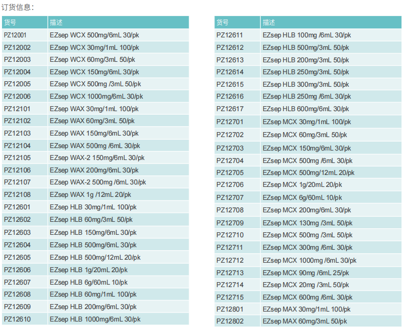 EZsepTM WAX:混合型弱阴离子交换反相吸附剂,由HLB吸附剂键合哌嗪基团得到,兼具弱阴离子交换和反相两种保留模式,适用于pKa值小于1的强酸性化合物,比如含有磺酸、磷酸等基团的化合物。