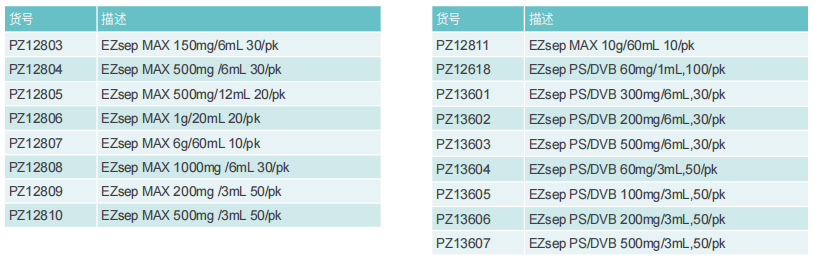EZsep™ PS/DVB:未取代聚苯乙烯/二乙烯苯吸附剂。比硅胶基质C18吸附剂极性略强,加之高比表面积(>600 m2/g),对非极性和极性化合物具有极高的吸附性和样品容量,类似大孔吸附树脂。