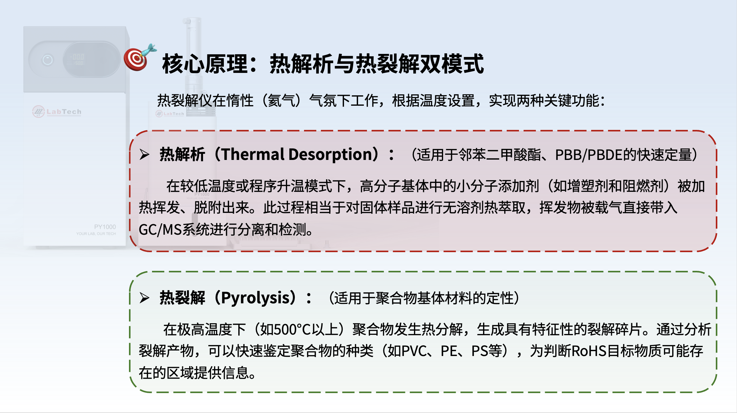 PY,因其快速、无溶剂前处理优势,已成为满足RoHS指令中,尤其是邻苯二甲酸酯等高分子材料有机有害物质快速筛查和定性定量分析的权威技术手段。